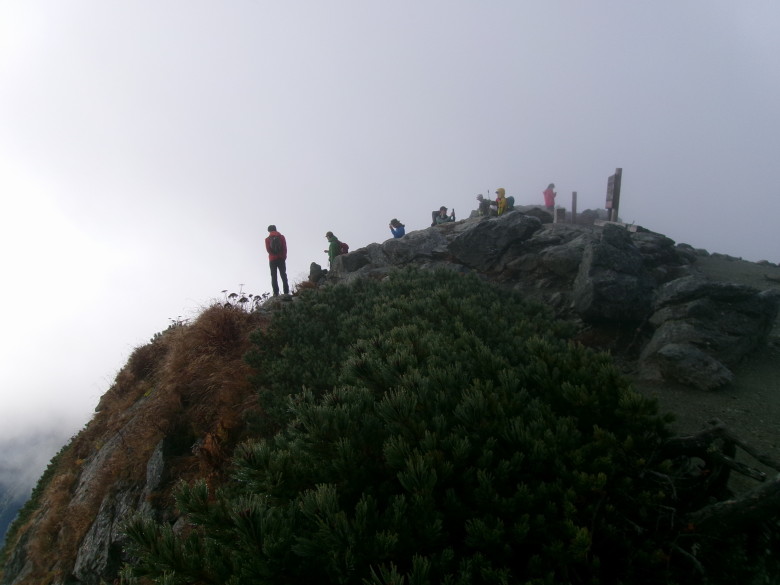 6時半前に肩の小屋を出発。山頂付近のガスは取れてなく、先行する登山者もガスで霞み、この先の天気に不安を感じた。