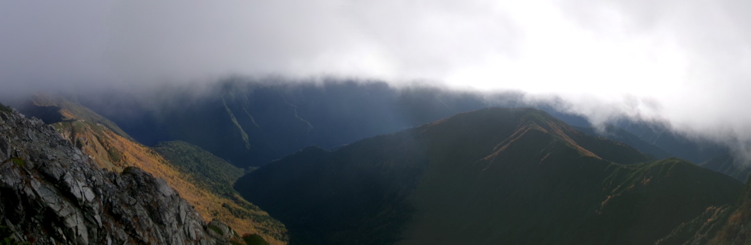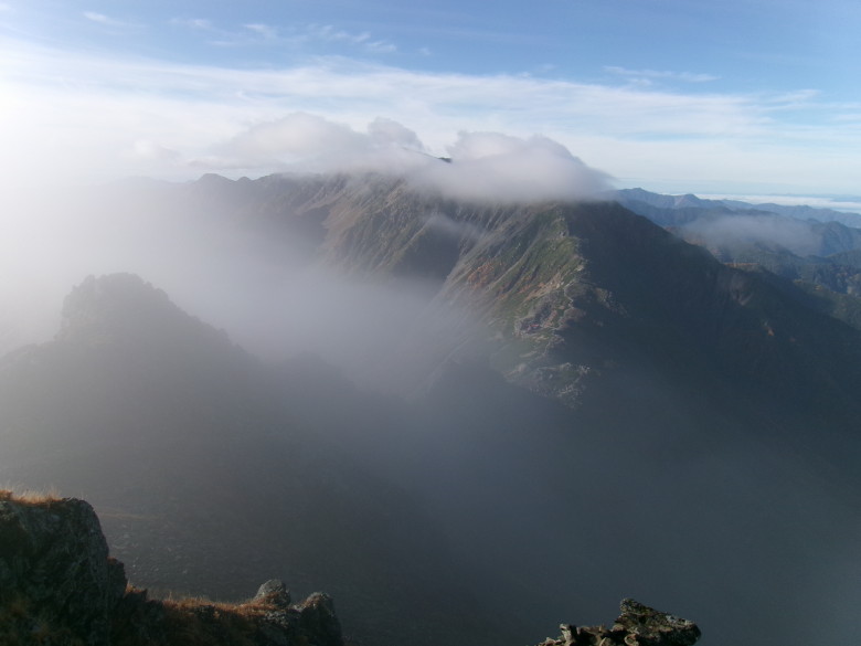 北岳山頂にて雲の下の大樺沢と池山吊尾根