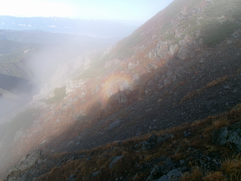北岳山頂を少し下るとガスが薄くなり、山頂にガスのかかる間ノ岳も見えた。やはりガスは山頂部だけだ。更に下った地点ではブロッケンが現れ、ガスとともに消えていった。