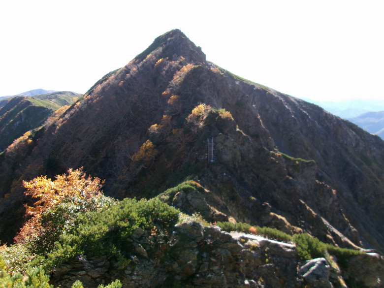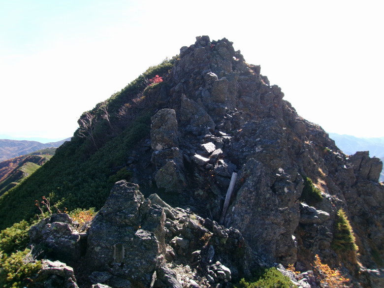 9時前に八本歯の頭に立てた。天気にも恵まれて素晴らしいの一言。写真を撮り終えハイマツ帯を下るが、このハイマツ帯が難所となる迷路。道と思しき所を下っているとハイマツの枝が茂って通行止め状態。入り口を間違えたためか、振り返ってみても途中に分岐や別の道も見当たらない。近くの道らしき露岩帯を目掛けゴメンナサイしてハイマツ帯を強行突破。その露岩帯も少し歩くとハイマツで通行止め。更に強行突破して平坦な場所に繋がる露岩帯で出ることができた。天気のいい日にこんな状態に濃いガスのかかる時には間違った方向に進んでしまう怖さがあり、そういう時のためにも地図アプリも必要だ。
