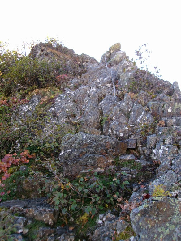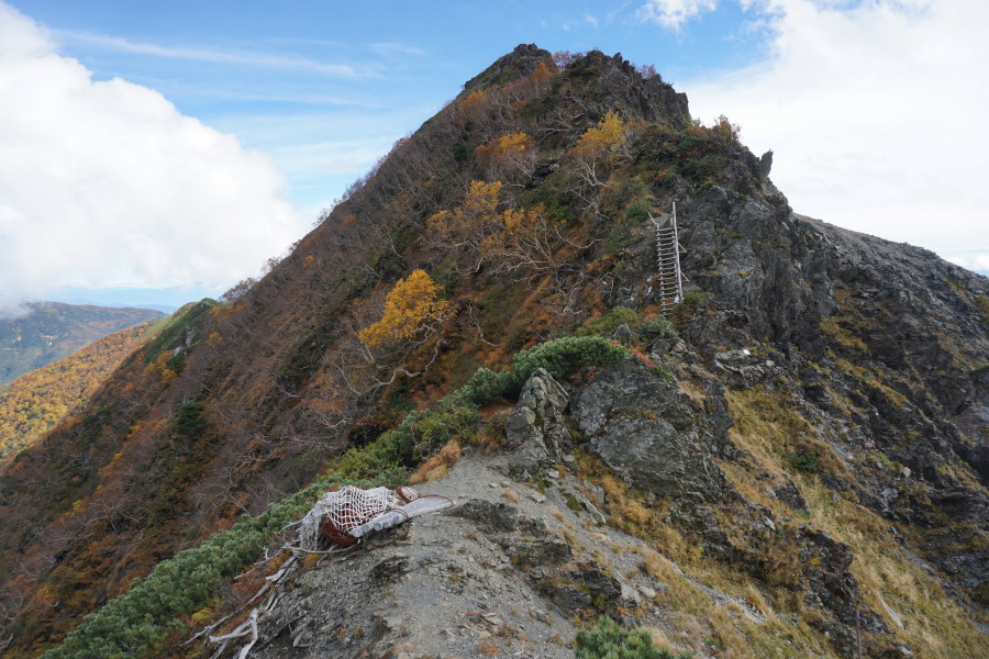 8時半過ぎに八本歯のコルに到着。ここでストックをザックに括り付け、ヘルメットを被り八本歯に取り付く。木製のはしごを過ぎた岩壁、手がかり足がかりがしっかりしており、三点支持で慎重に登る。トラロープが垂れている岩壁や岩を取り巻くトラロープ、これらは登るルートや巻き道をガイドしてくれており、迷うことなく登ることが出来た。