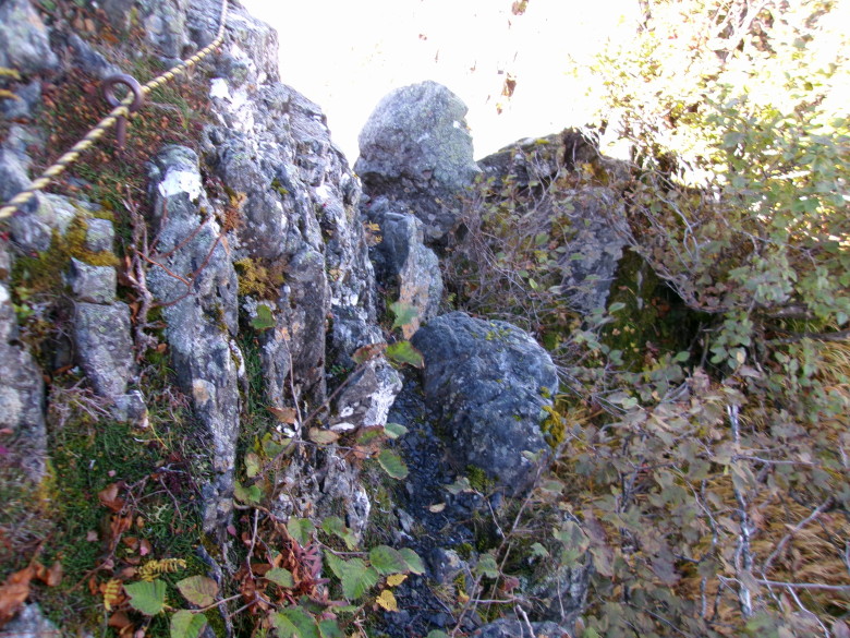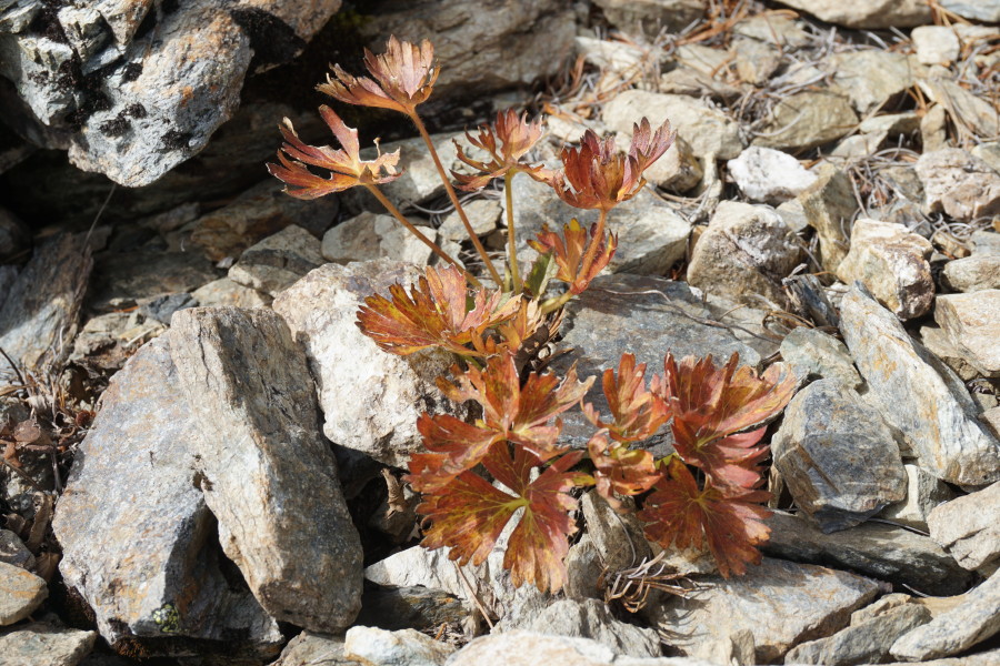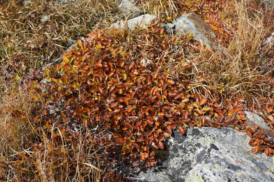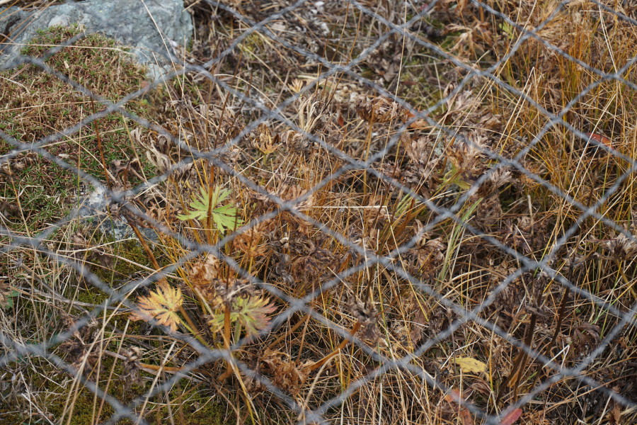 13時前にトラバース道に入ってキタダケソウを探した。この時期キタダケソウはどんな状態で冬を迎えようとしているのか、実や種子はどうかなど、花が咲いていたころの葉の形状をもとに足元を中心に探した。保護ロープの内側にも枯れた植物が見えるが遠目では分からない。それらしき植物は見当たらないが、それでもチョウノスケソウだけは確認できた。