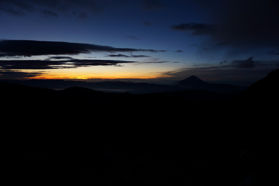 17時すぎに窓が開いたように富士山が見え、ガスが消え始めた。小屋の外にはほかの宿泊者も出て富士山の夕暮れを見守っていた。夕日に薄いオレンジ色となった富士山に明日の天気も期待できそうだった。