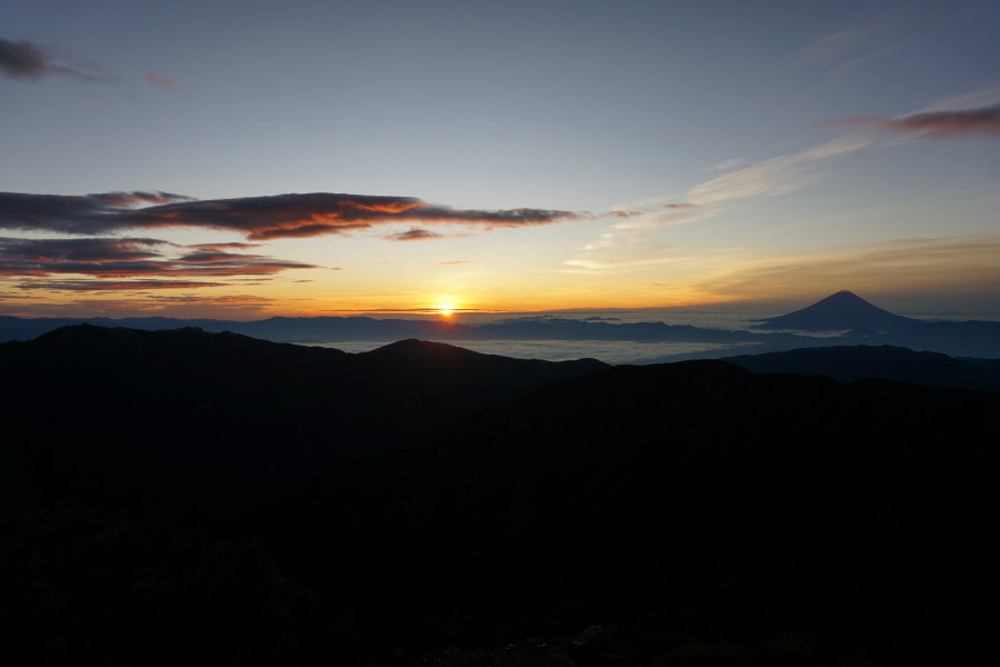 昨晩のガスは消え晴れの天気、ただ北岳山頂にはガスが掛かっている。日の出と富士山、朝日のあたる甲斐駒ヶ岳や仙丈ケ岳と小屋の前で素晴らしい景色を拝むことができた。