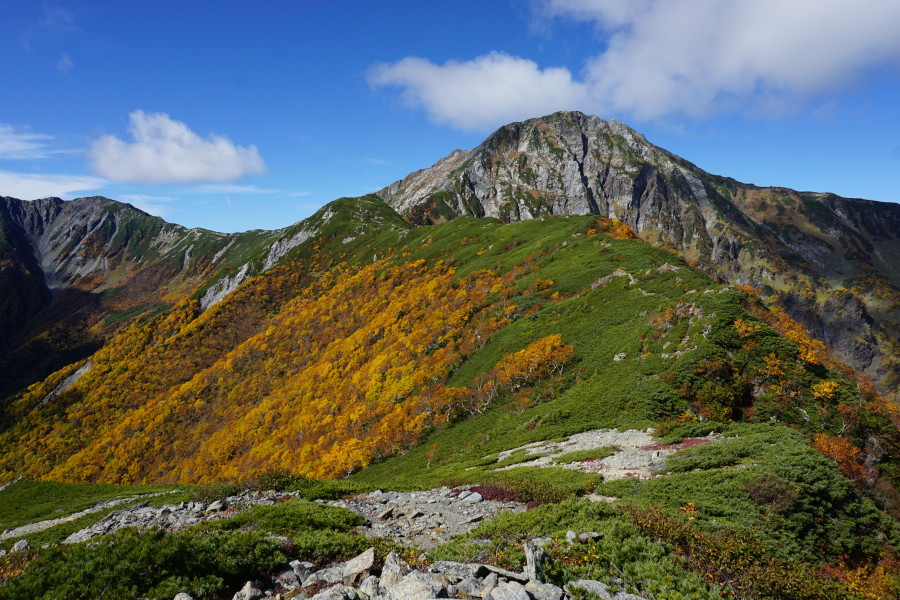 ボーコン沢を出発、吊尾根斜面の紅葉が見事