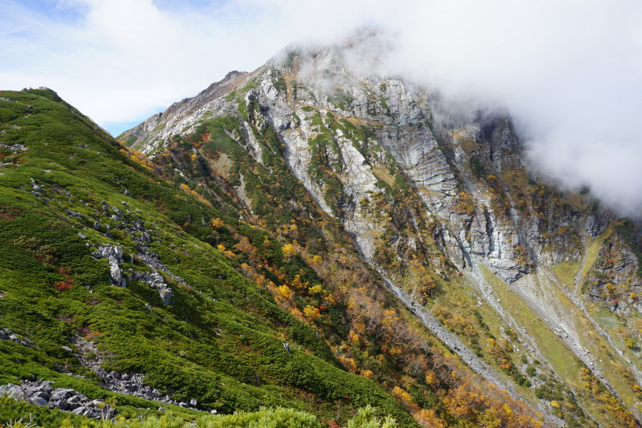 トラバース分岐を過ぎ振り返ると北岳にガスはかかっていない。北岳山頂部からバットレスの側面、大樺沢、広河原まで想定を超える素晴らしい景色はまさに北岳の横顔を見ているようだった。