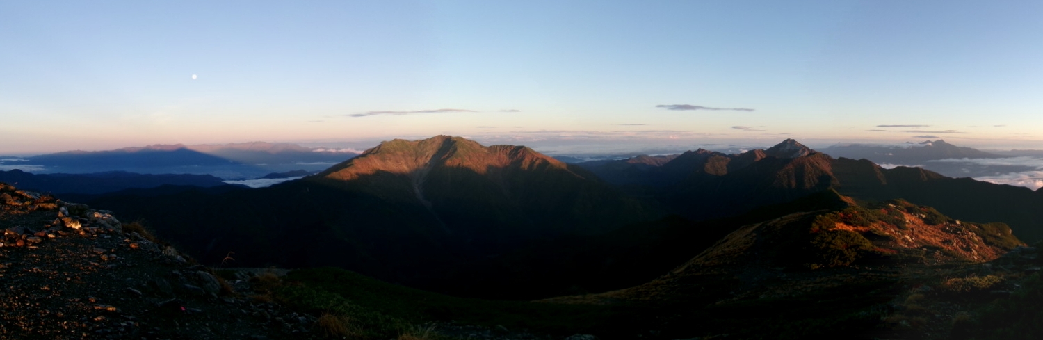 北岳山荘にて北岳、八本歯の頭から富士山へのパノラマ