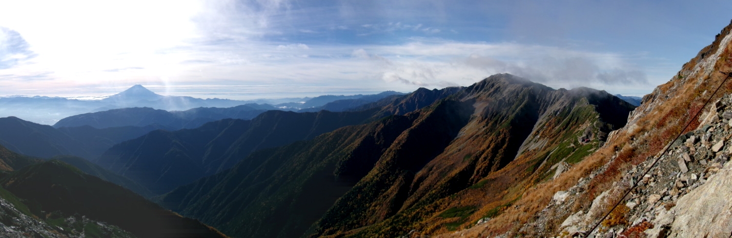 トラバース道で見る富士山から間ノ岳、左端に八本歯の頭