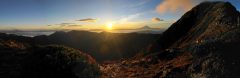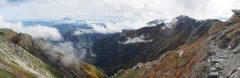 ジャンダルムにて前穂高岳から西穂高岳にかけてのパノラマ。眼下に上高地。(2012/10/08)  ジャンダルムにて笠ヶ岳方面のパノラマ(2012/10/08)